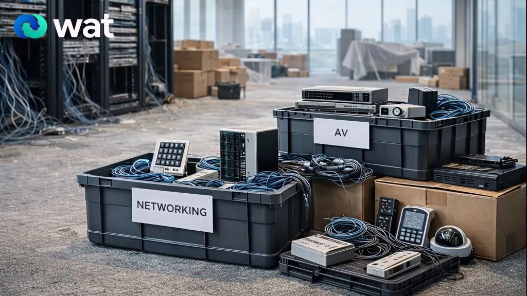 The problem is that move-related e-waste is rarely limited to obvious items like laptops and monitors. The most overlooked categories are often the ones embedded into the office environment: AV equipment, networking hardware, access control systems, and cabling. These assets may be owned by different departments, installed by vendors, and retired inconsistently—creating avoidable governance and security gaps.